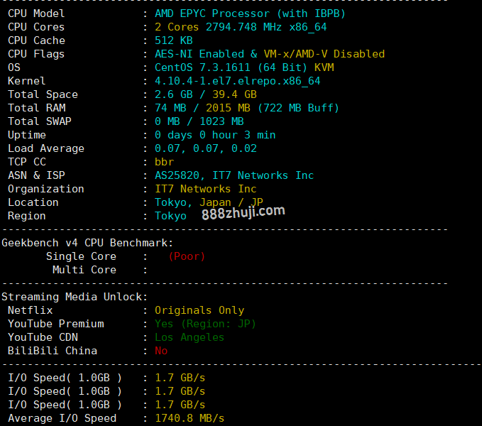 CPU:AMD EPYC(瓦工终于换了AMD平台,这一点让人惊喜),磁盘IO:1740.8 MB/s,很强悍。