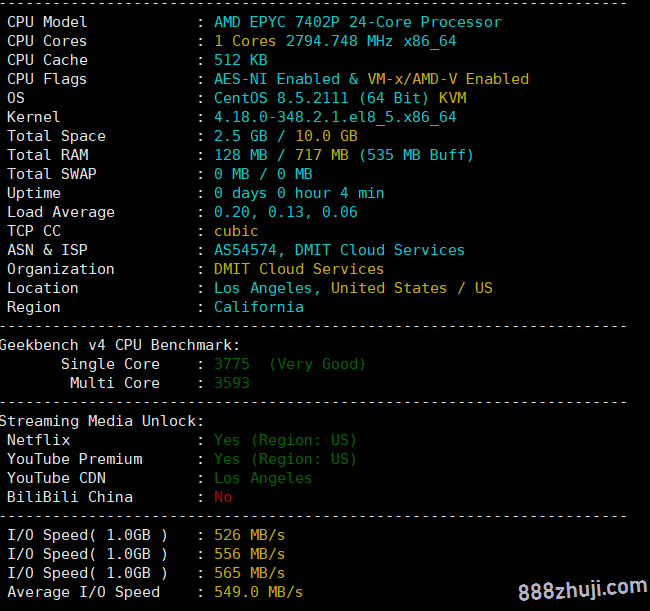 CPU:AMD EPYC 7402P 24-Core Processor,磁盘IO:549 MB/s,看得出来IP是美国原生。