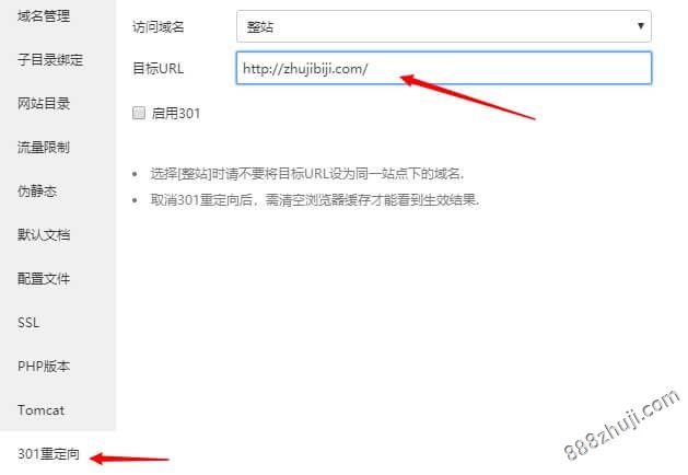 这里我们选择888zhuji.com,因为需要跳转到www.888zhuji.com,然后勾选301按钮。这里需要注意,我这边没有写HTTPS,如果你是有HTTPS的也需要设置这个。(我这里是演示打错了)